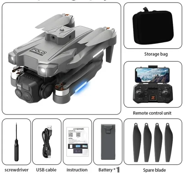 Drone * 1 remote control * 1 body battery * 1 USB cable * 1 screwdriver * 1 spare fan blade * 4 drone manual * 1 APP manual * 1 color box * 1